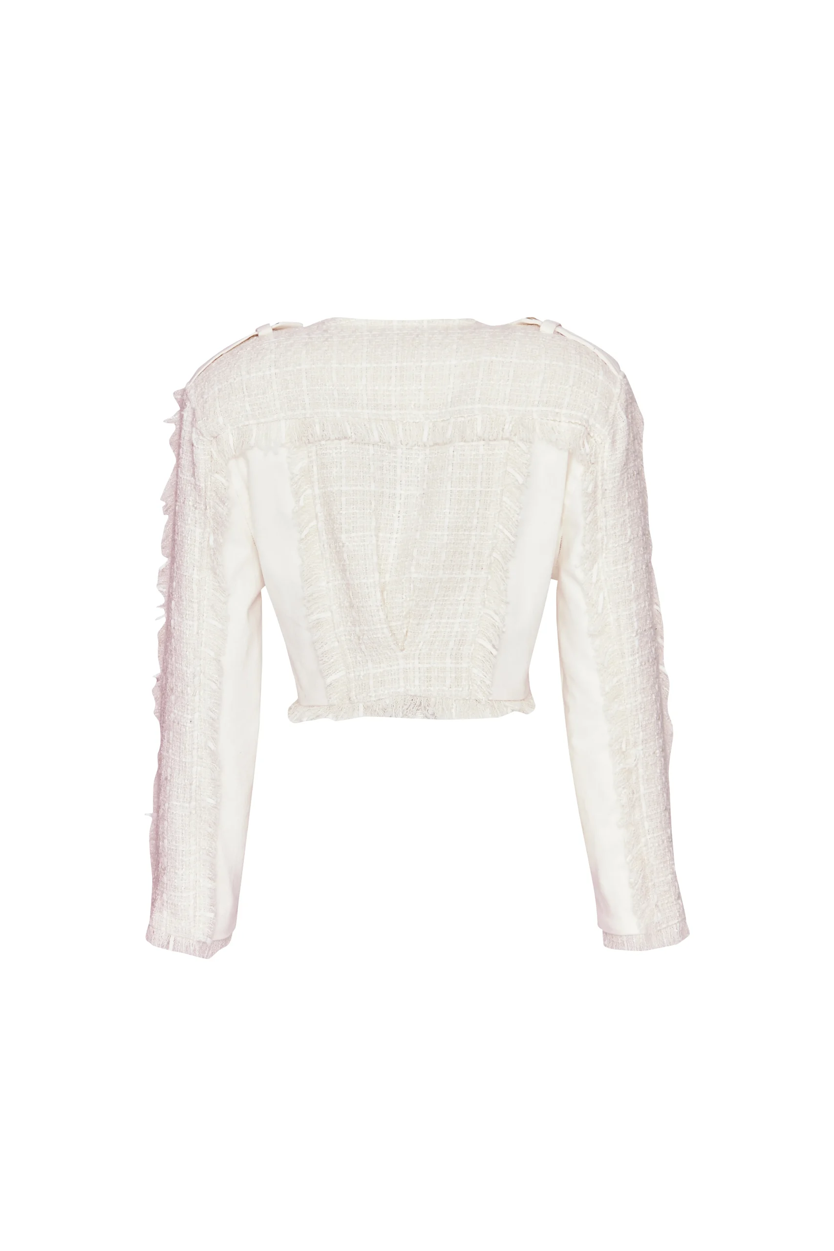Tweed and denim fabric. Shoulder epaulets. Chest pocket detail. Button closure. Length: 42 cm. Model is wearing size S. Model’s size is 36.