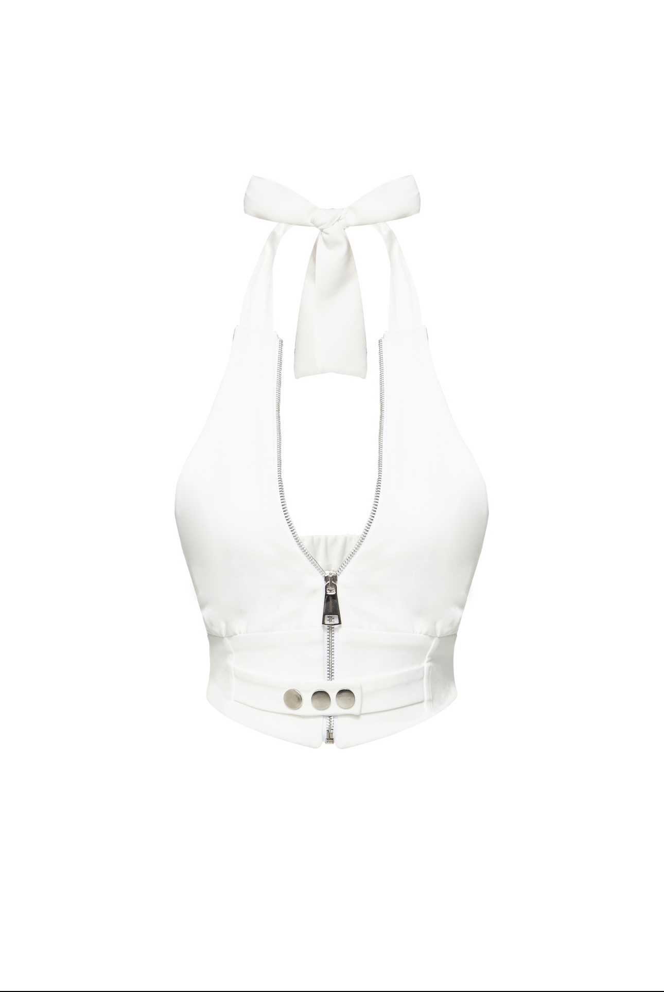 The top features a zipper and snap fastener detail at the front, and an elasticated back.