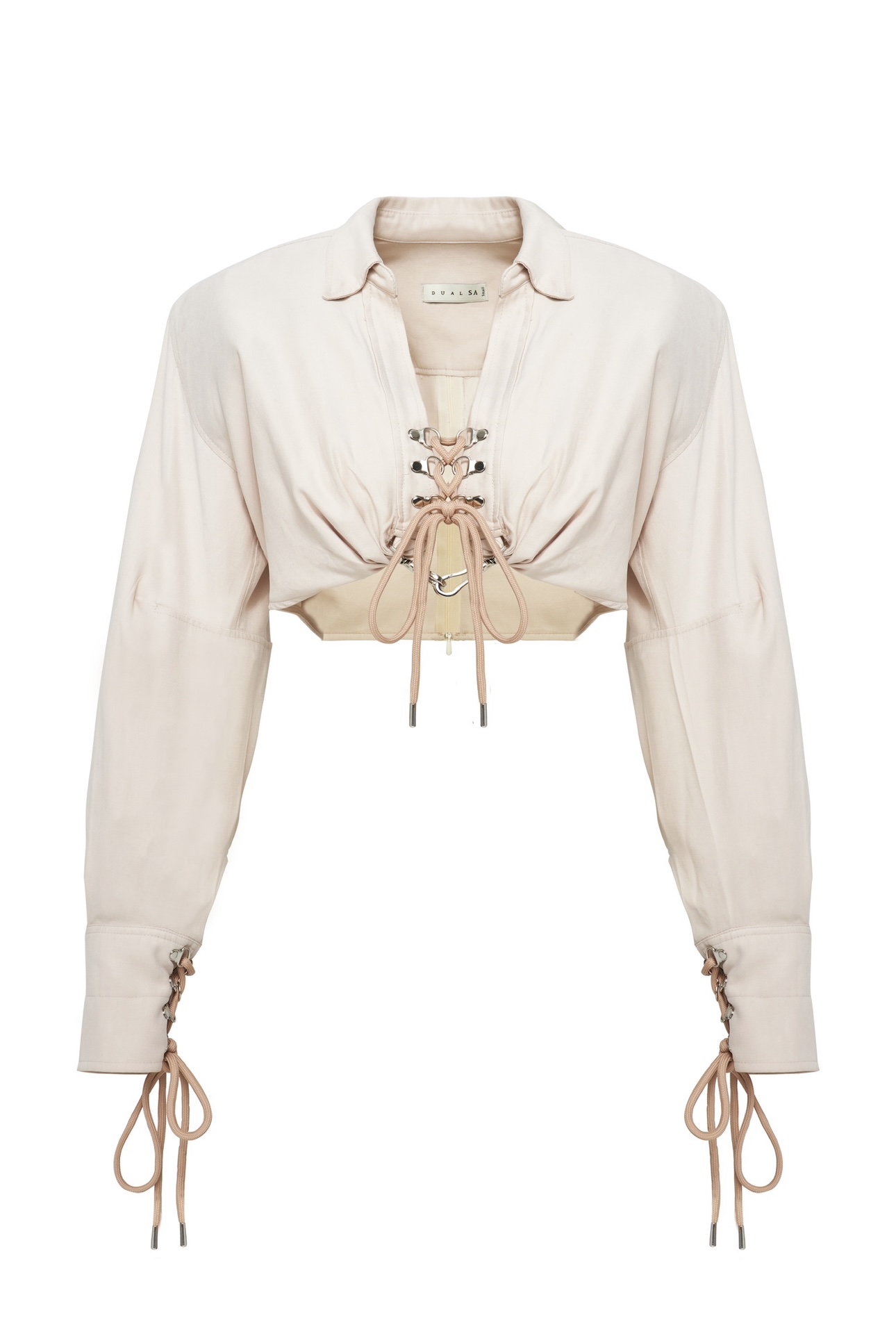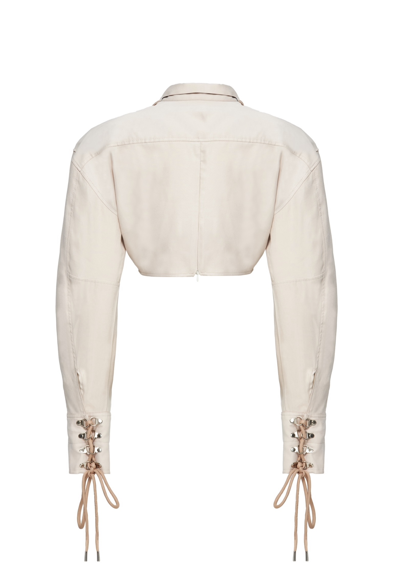 Shirt with eyelet detail on the front and sleeves. Hidden zipper closure at the back.