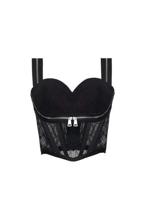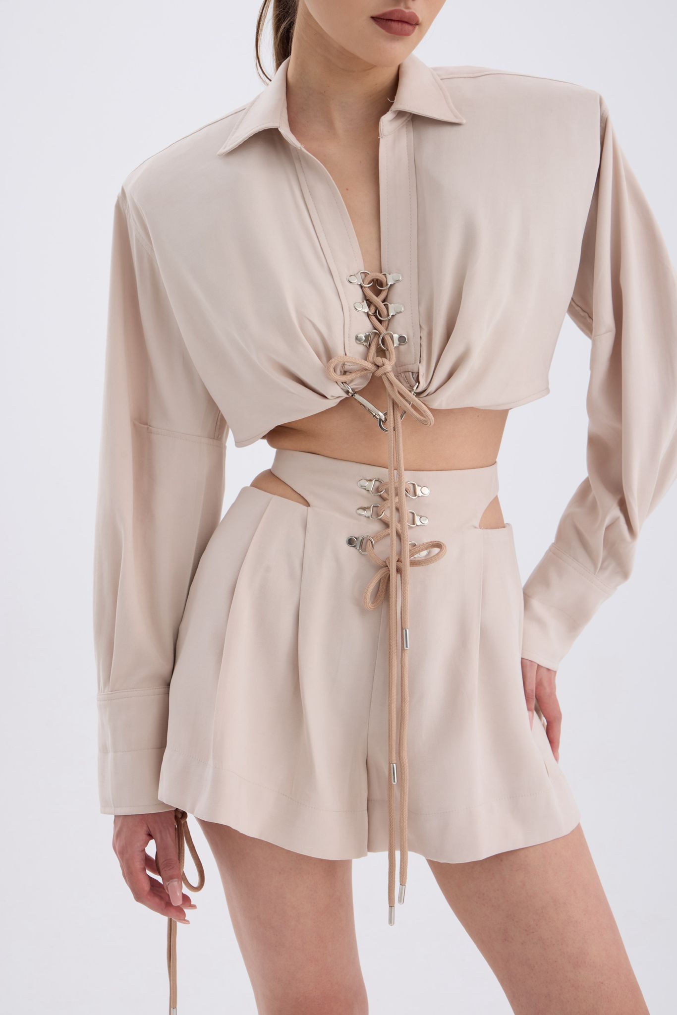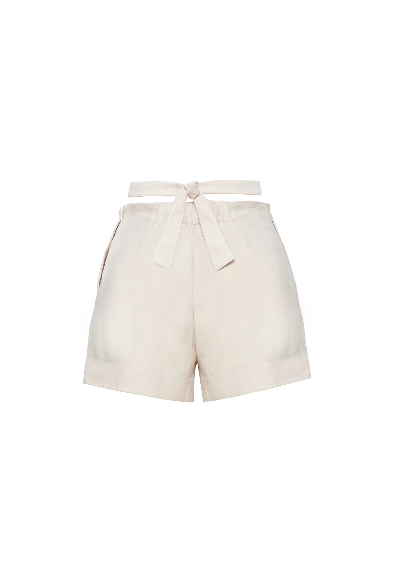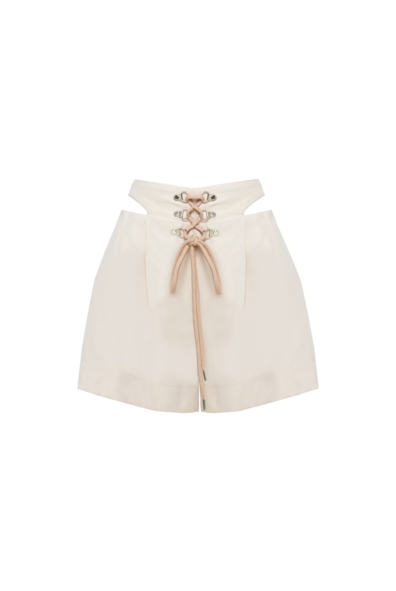 The front of the shorts has eyelet detail and a hidden side zipper closure.