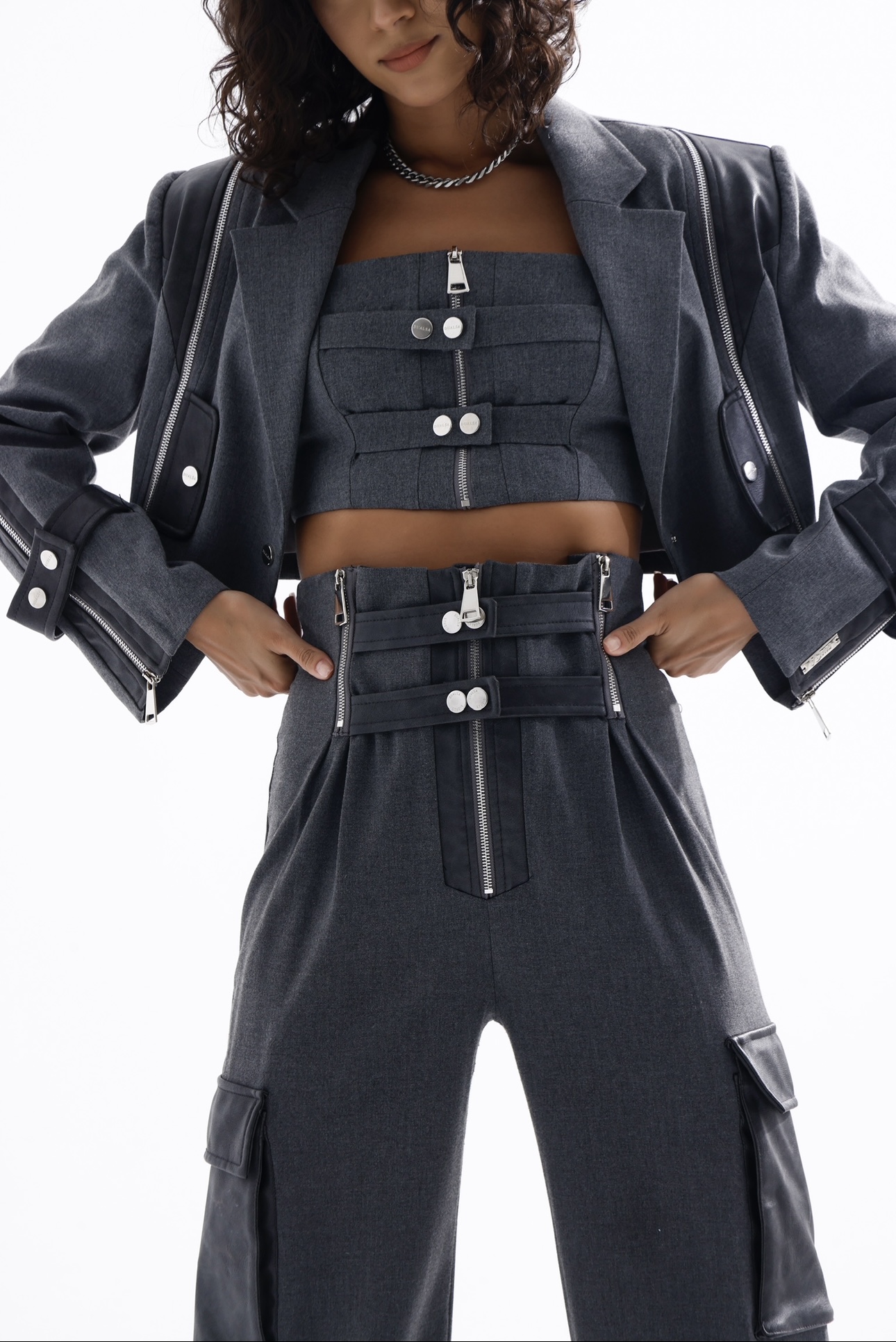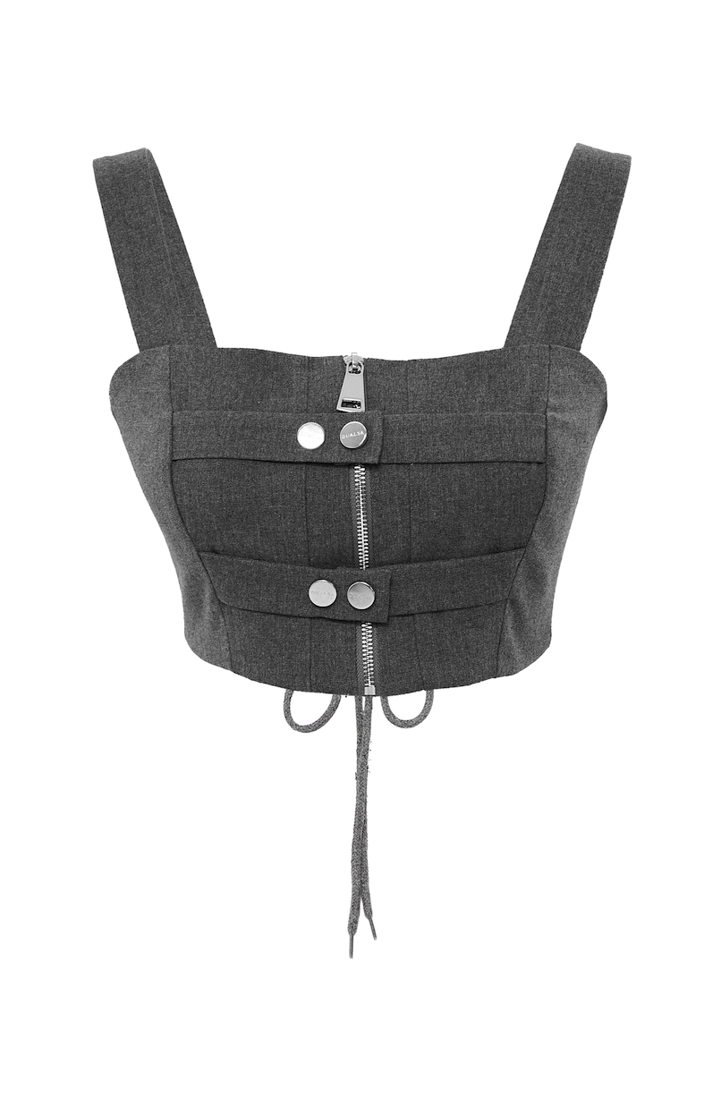 The top features a zipper and snap fastener detail at the front, and an eyelet at the back.