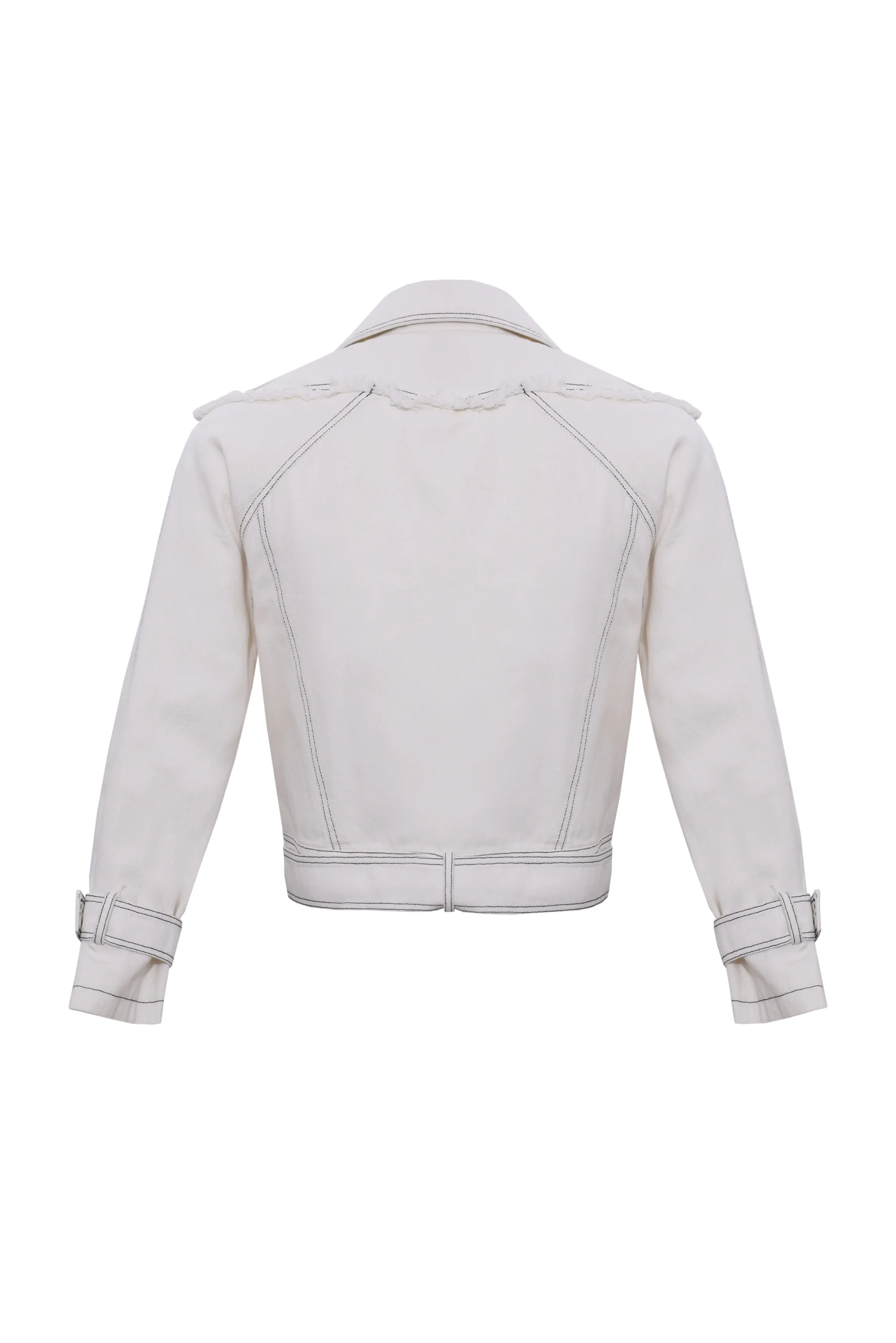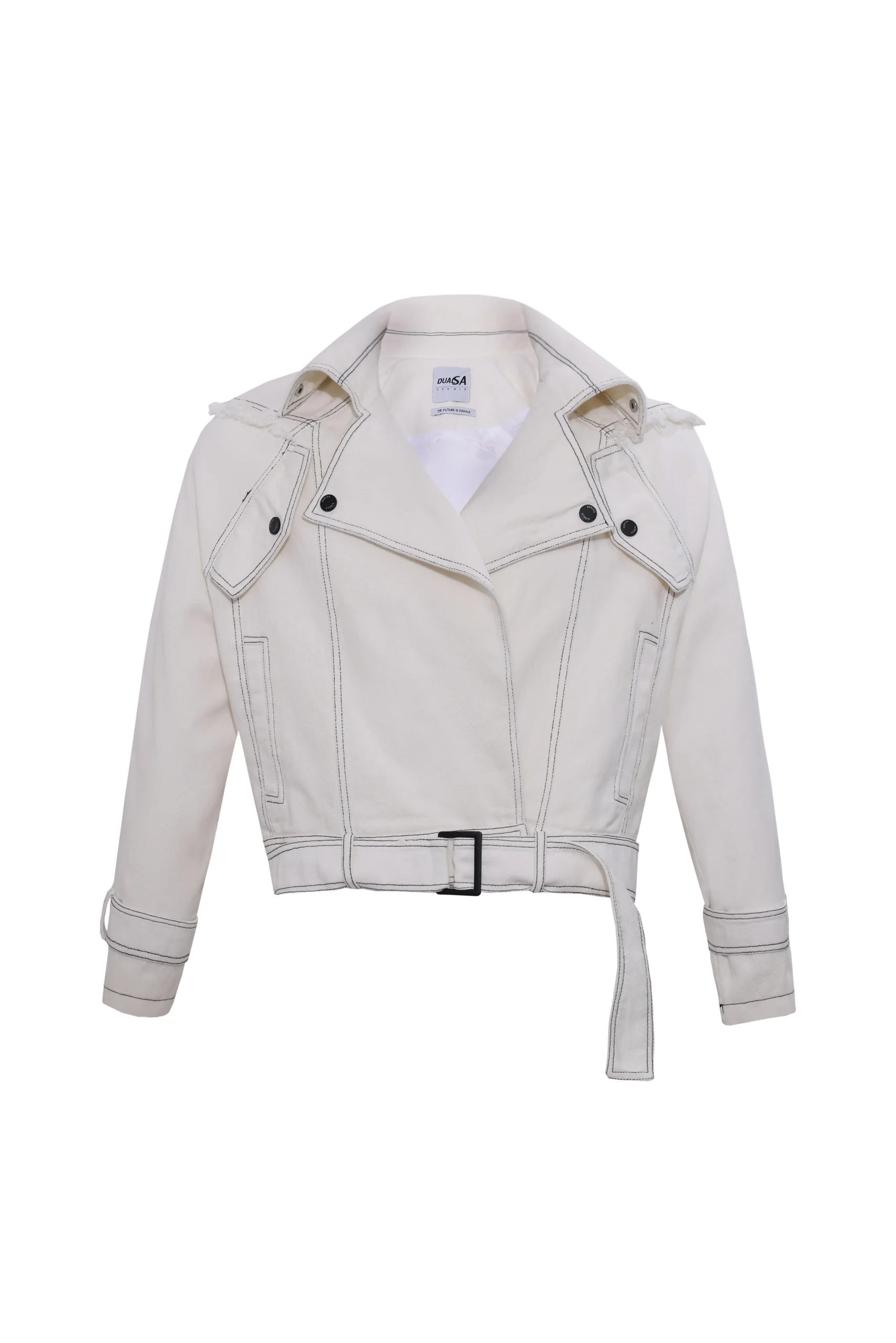 Denim fabric, oversized, short belted jacket, lined, single flap breast pocket, button closure, epaulets at the cuffs. Length: 55 cm. Model is wearing size S. Model measurements: Size: 36 | height: 1.75 cm | bust: 85 cm | waist: 62 cm | hips: 90 cm