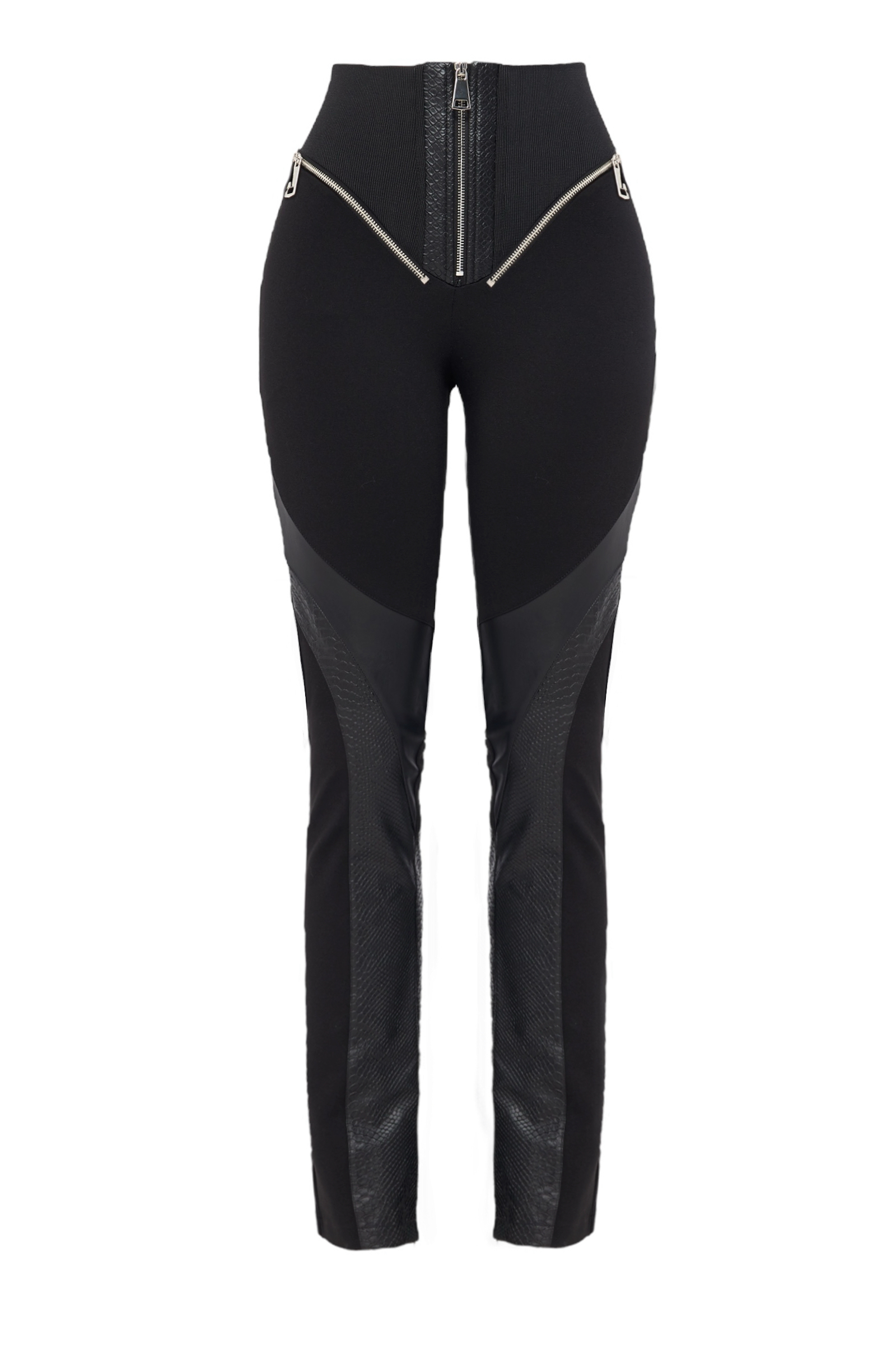 Three types of fabric were used. High waist, elasticated waistband, side zipper, slit at the hem, hidden zipper, shaping lycra leg style, flare. Length: 117 cm. Model is wearing size S. Model’s measurements: Size: 36 | Height: 1.75 cm | Bust: 85 | Waist: 62 | Hips: 90