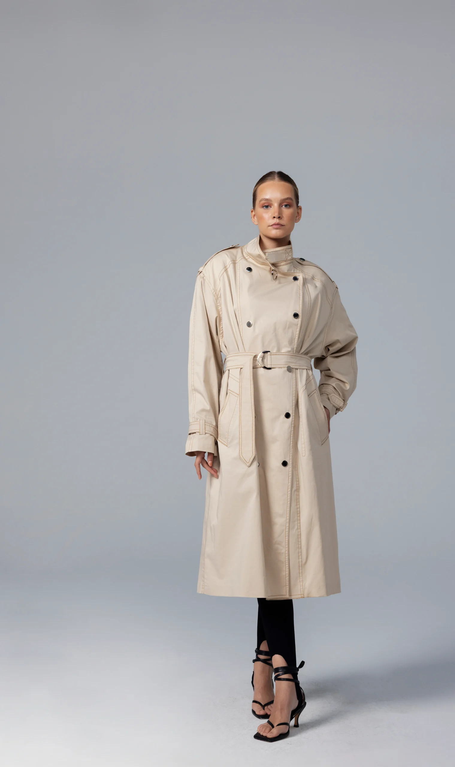Oversize gabardine fabric, unlined, shoulder epaulets, sleeve cuff epaulets, side pockets, detachable belt, back slit. Length: 120 cm. Model is wearing size S. Model measurements: Size: 36 | height: 1.75 cm | bust: 85 cm | waist: 62 cm | hips: 91 cm
