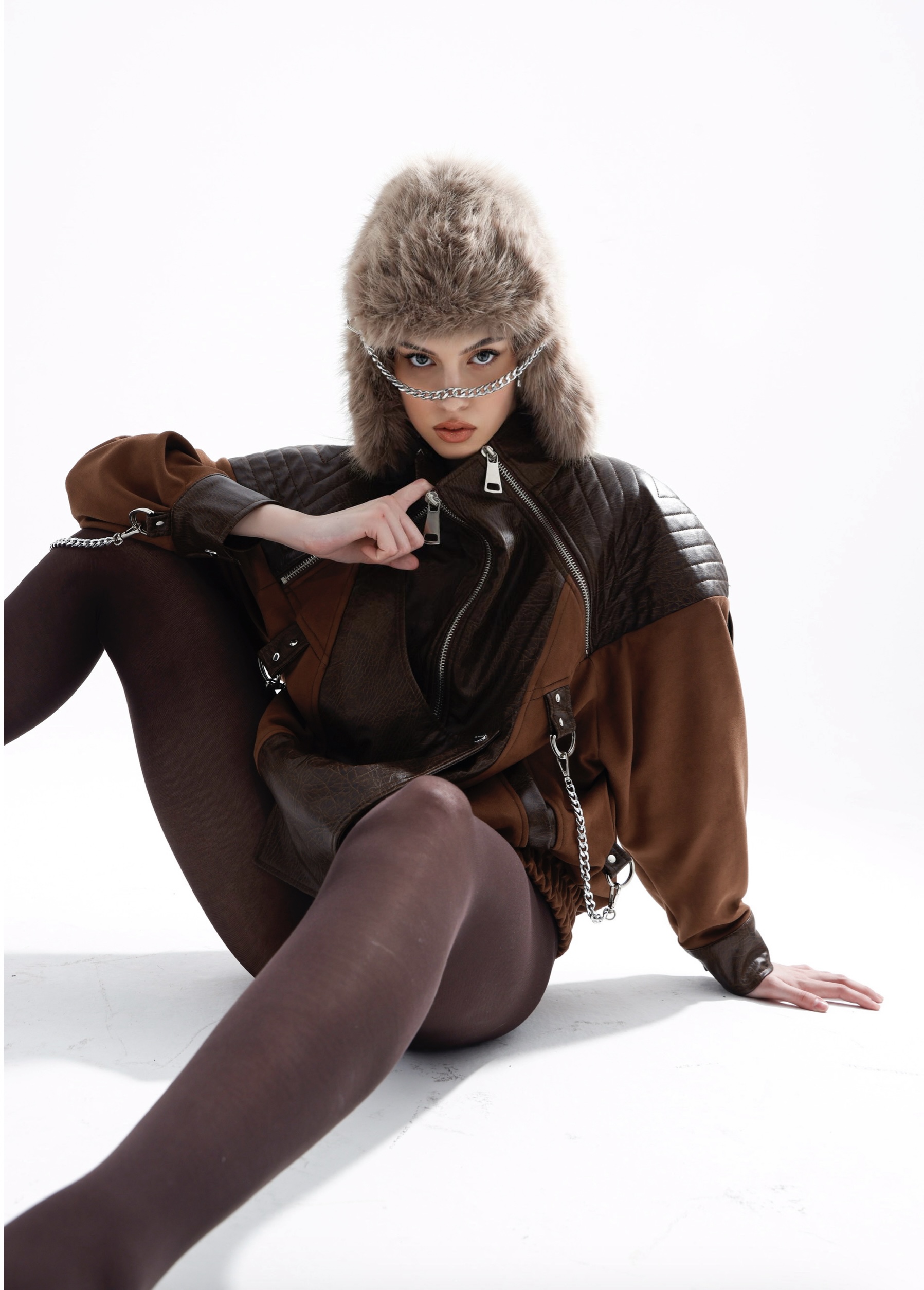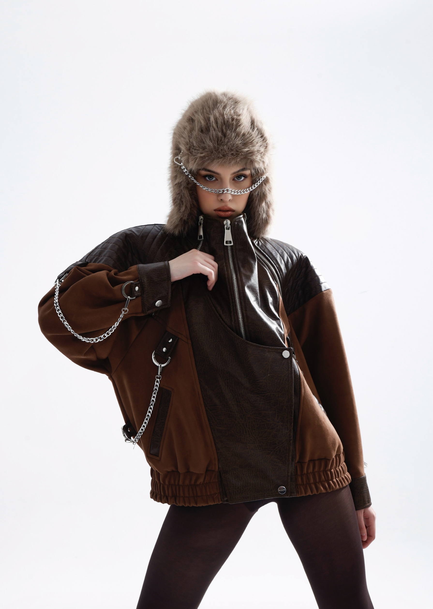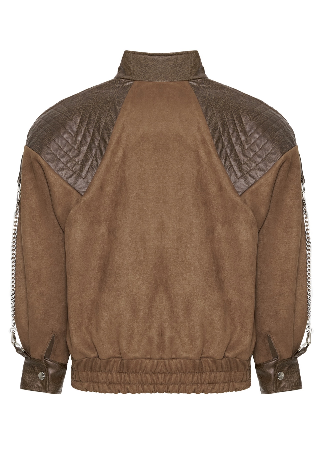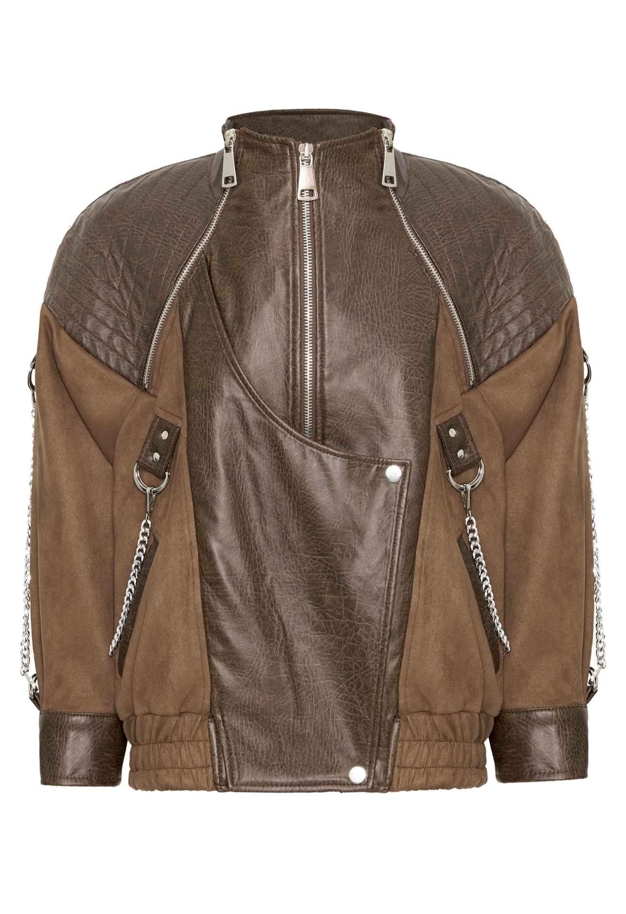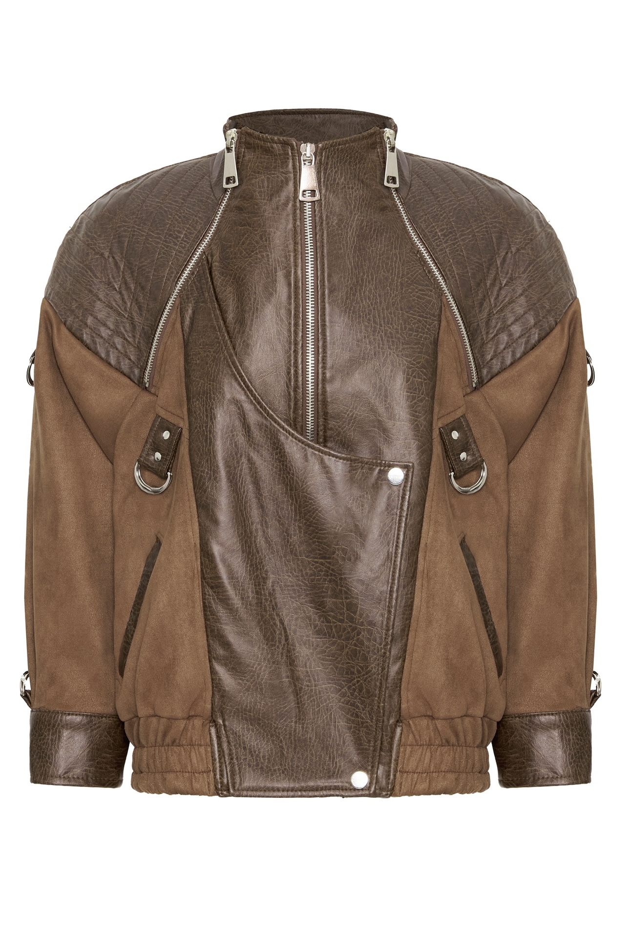 Made from faux leather and suede fabric. Oversize Boy. Lined shoulder stitch detail. Chest zipper detail. Zipper closure. Front placket button closure. Single flap side pocket. Side lined pocket. Sleeve flap pocket with elasticated ankles. Length: 71 cm. Model is wearing size S. Model measurements: Size: 36 | height: 1.75 cm | chest: 85 cm | waist: 62 cm | hips: 90 cm