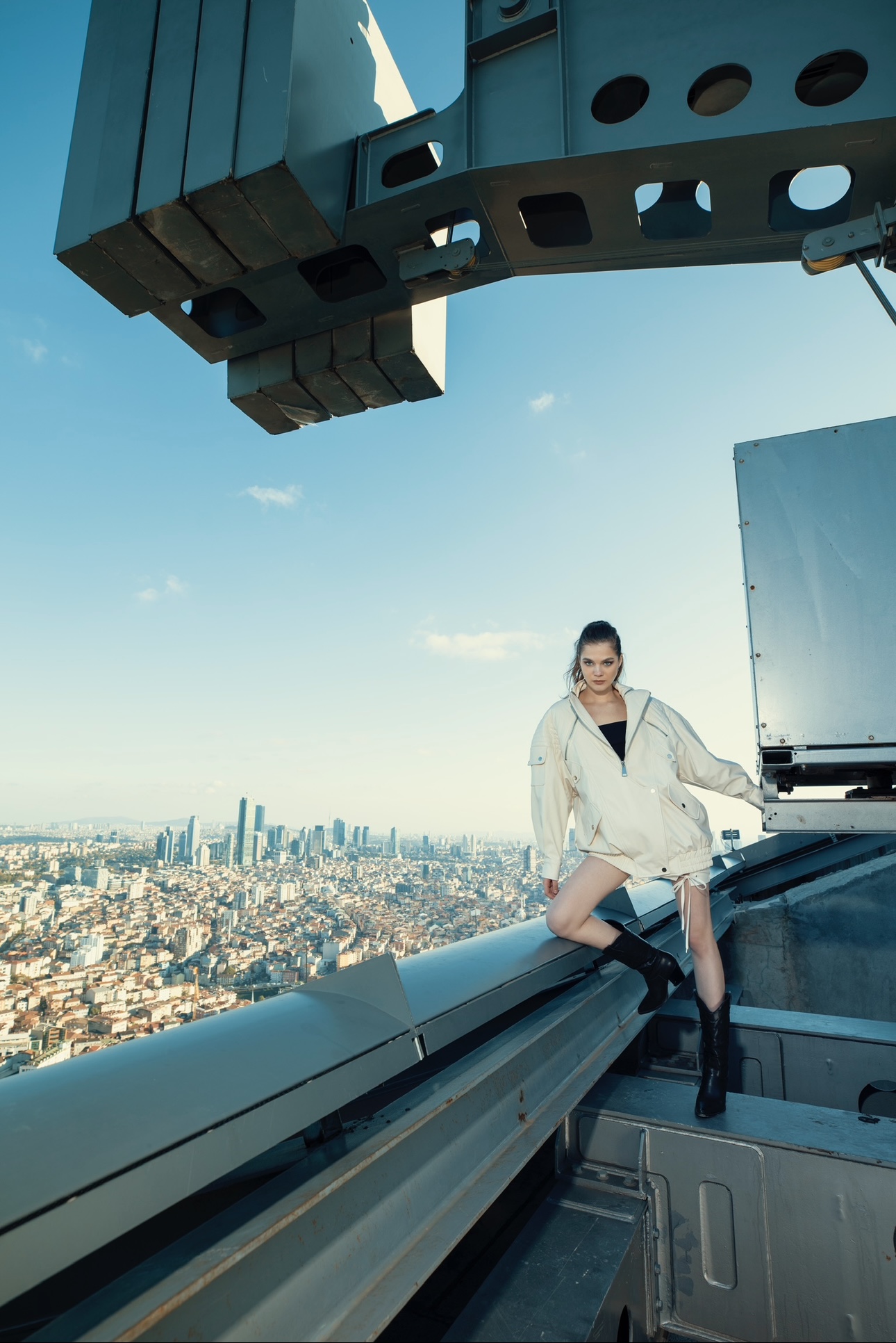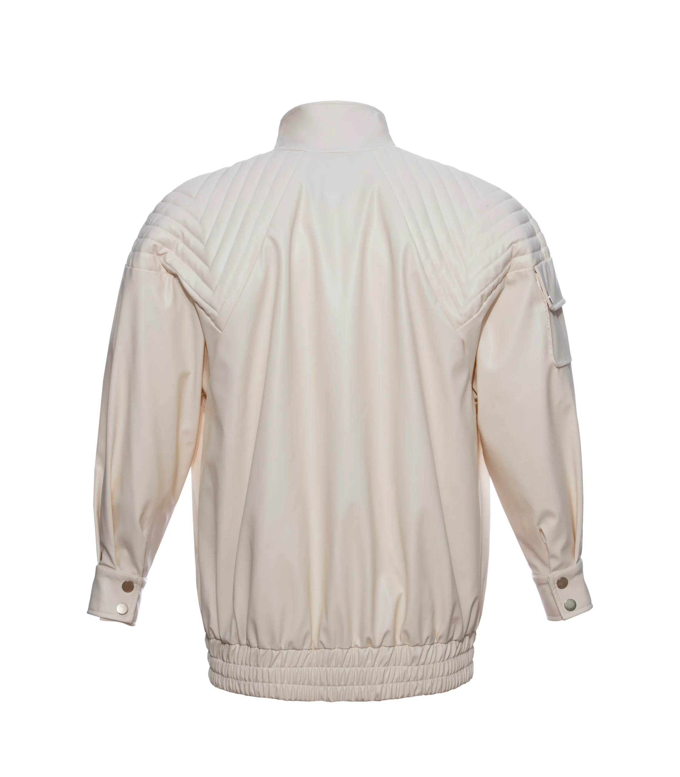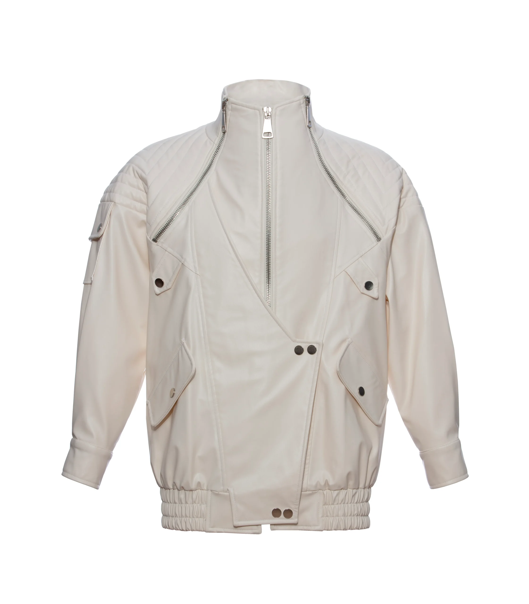 Made of faux leather Oversize Length Lined Shoulder stitch detail Chest zipper detail Zipper closure Front placket button closure Single flap side pocket Side lined pocket Sleeve flap pocket foot elastic Length: 80 cm Model is wearing size S Model measurements: Size: 36 | height: 1.75 cm | chest: 85 | waist: 62 |hips:90
