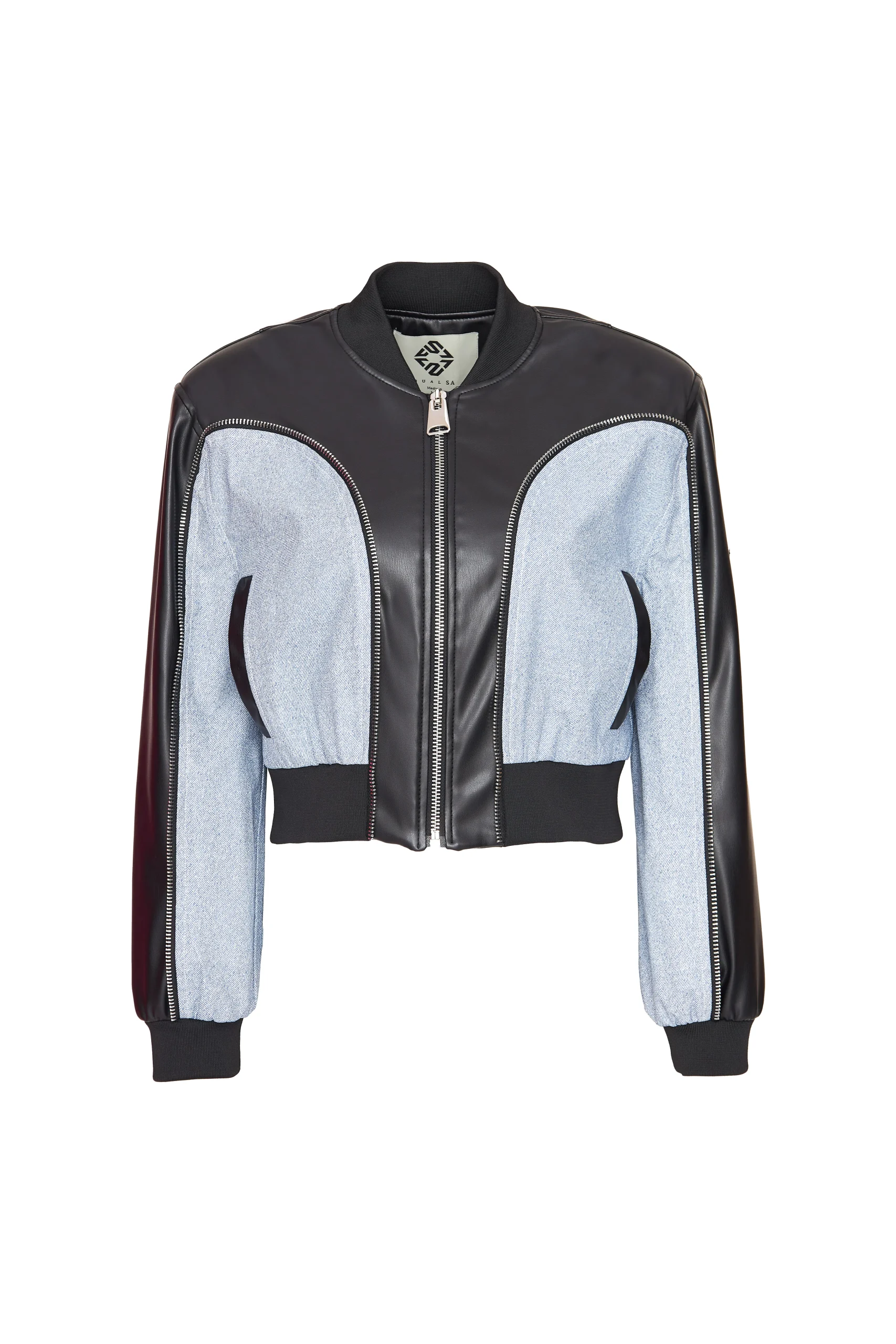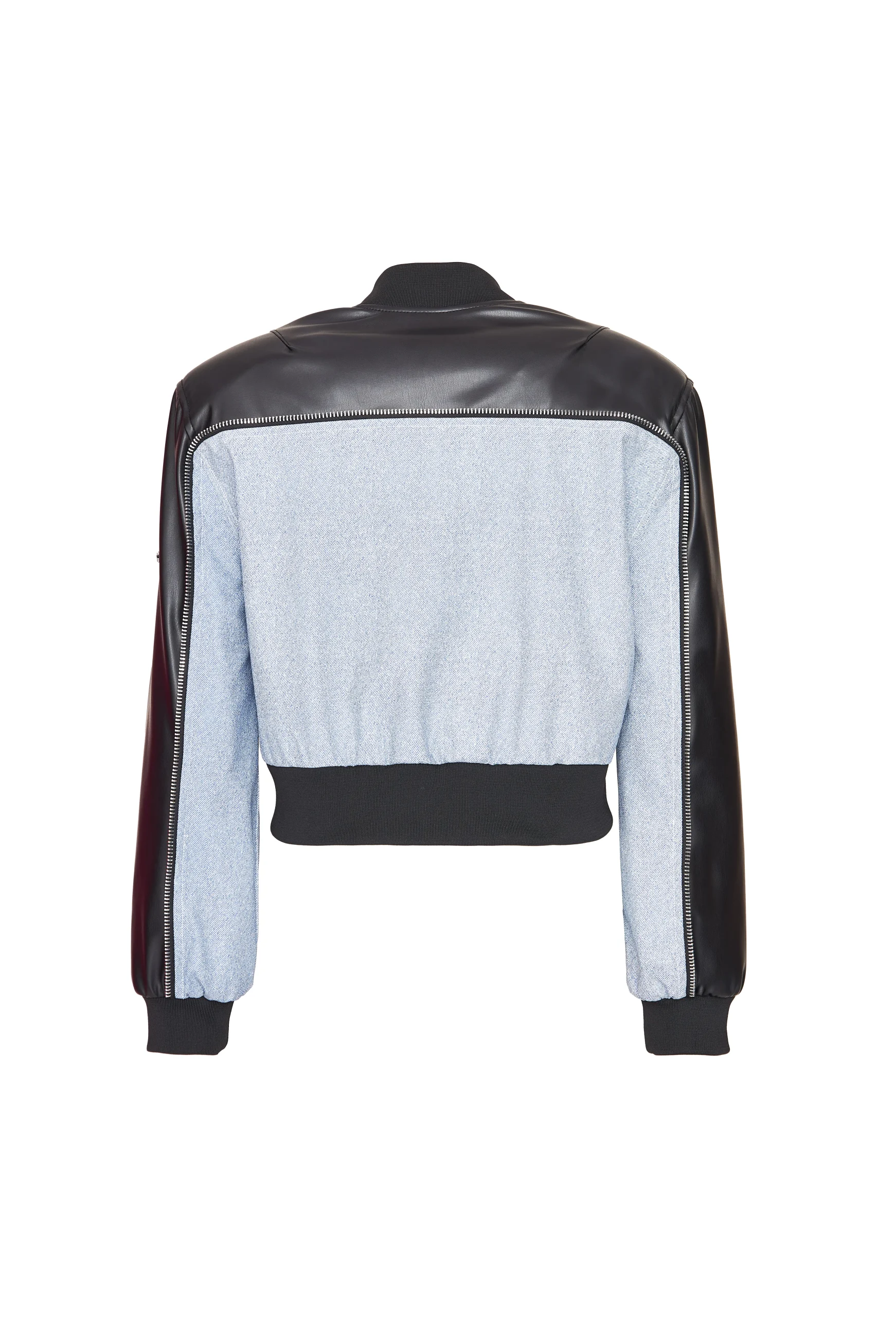 Made from faux leather. Fitted cut. Lined zipper closure. Two-tone. Side welt pockets. Ribbed cuffs and collar. Product height: 50 cm. Model is wearing size S. Model’s measurements: Size: 36 | Height: 1.75 cm | Bust: 85 | Waist: 62 | Hips: 90
